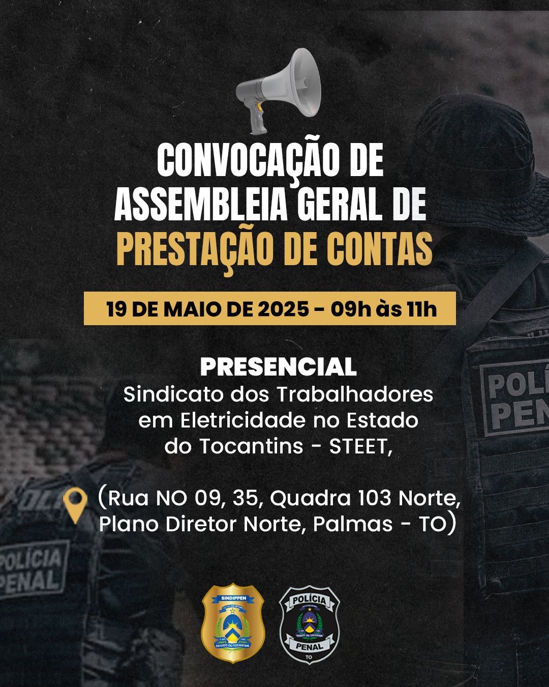 O Sindicato dos Policiais Penais do Tocantins (SINDIPPEN-TO) convoca todos os Policiais Penais para participar da Assembleia Geral que será realizada amanhã, dia 5 de