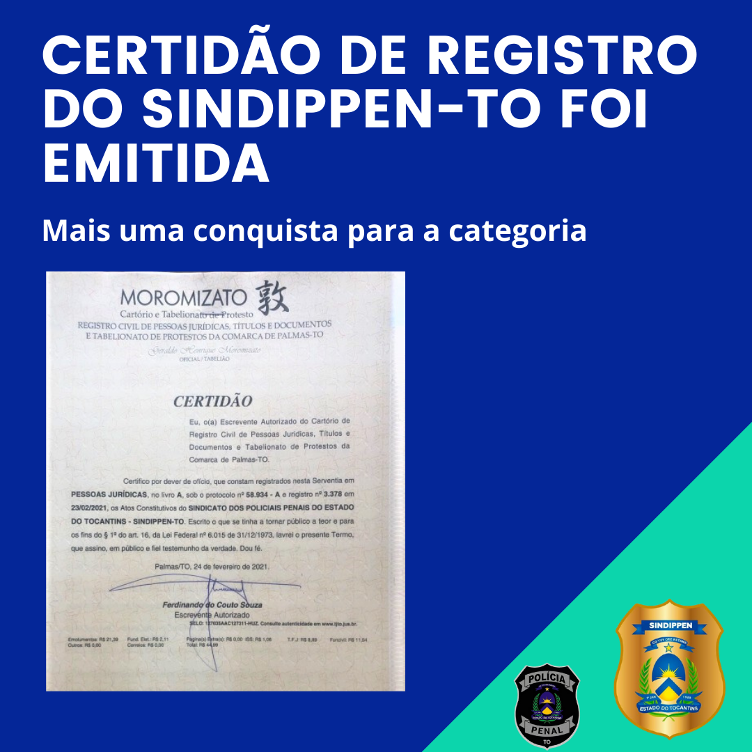 Após a Assembleia Geral realizada em dezembro de 2020 e a aprovação da criação do Sindicato dos Policiais Penais do Tocantins (SINDIPPEN-TO), no último fim de semana, 06 de março, o cartório de registros emitiu a Certidão necessária para efetivar o Sindicato.