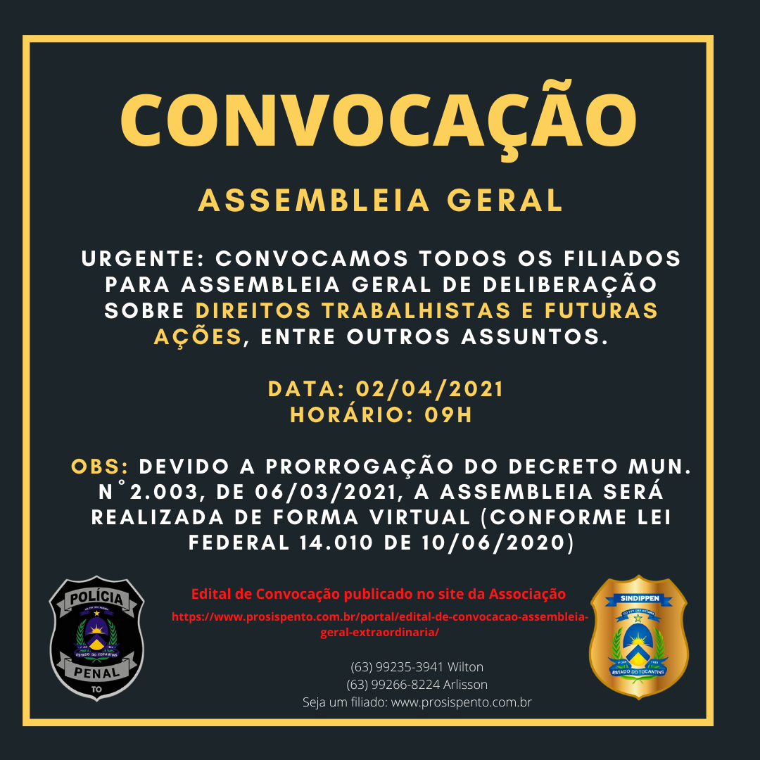 O Presidente da ASSOCIAÇÃO DOS PROFISSIONAIS DO SISTEMA PENITENCIÁRIO DO TOCANTINS – PROSISPEN, nos usos das suas atribuições legais, em caráter de urgência, conforme art. 14, I, do Estatuto, convoca todos os associados quites com as suas obrigações estatutárias para Assembleia Geral Extraordinária a ser realizada no dia 02 de abril de 2021, no Sindicato dos trabalhadores em eletricidade do estado do Tocantins Quadra 103 Norte, Rua – NO 09, Centro, Palmas/TO, às 09:00hrs (vinte horas) em primeira convocação com a presença da metade dos Associados e, não havendo quórum suficiente, 30 minutos após em segunda convocação com a presença de qualquer número de presentes. Pauta em anexo no edital.
