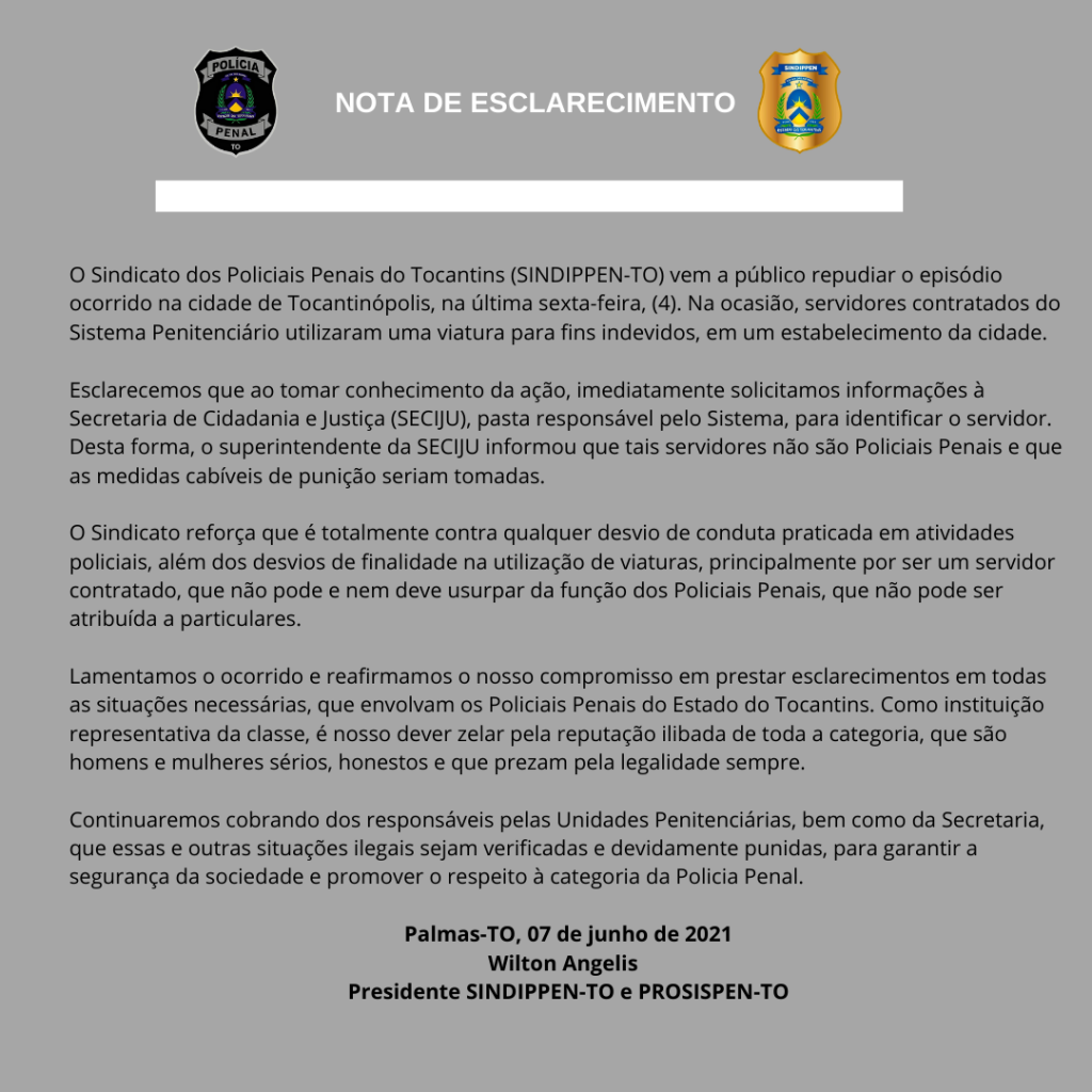 Lamentamos o ocorrido e reafirmamos o nosso compromisso em prestar esclarecimentos em todas as situações necessárias, que envolvam os Policiais Penais do Estado do Tocantins. Como instituição representativa da classe, é nosso dever zelar pela reputação ilibada de toda a categoria, que são homens e mulheres sérios, honestos e que prezam pela legalidade sempre.