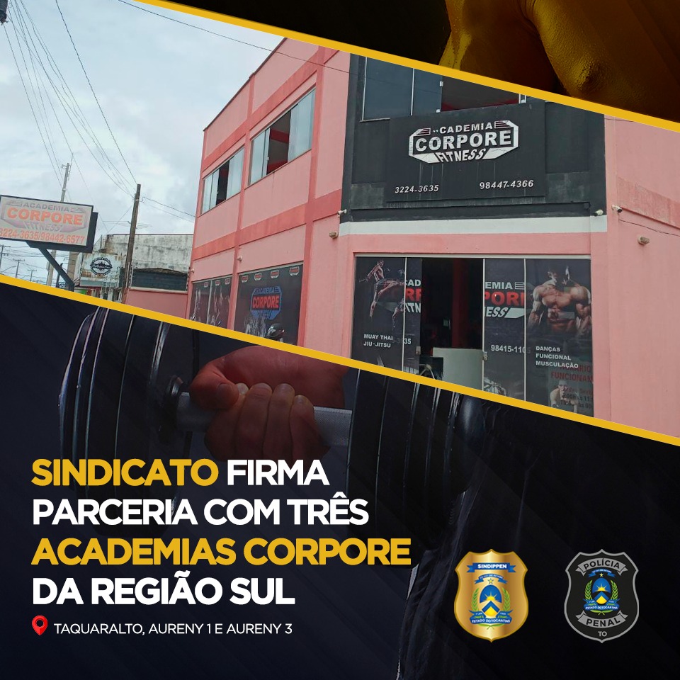 SINDICATO fecha parceria com as academias da rede CORPORE, localizadas em Taquaralto, próximo a lojas americanas, no Jardim Aureny I, próximo à feira coberta e a outra na avenida principal do Aureny 3 e em Miracema. Os policiais penais e seus dependentes poderão treinar, pagando apenas R$ 70,00 reais a mensalidade e terão acesso a qualquer numa das academias da rede. Além disso, é obrigatório a apresentação da funcional no ato da matrícula.