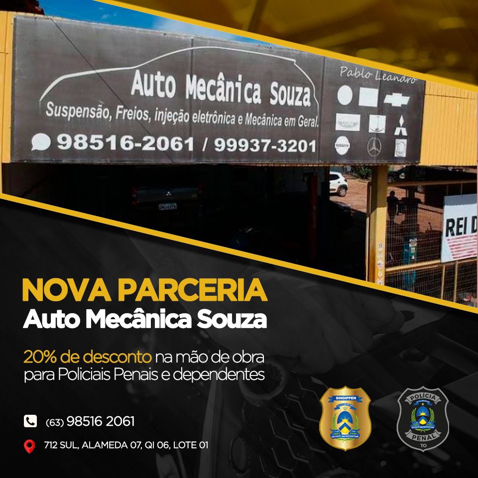 O SINDIPPENTO firmou uma nova parceria com a empresa Auto Mecânica Souza, que oferecerá 20% de desconto na mão de obra para Policiais Penais e dependentes. Localizada na quadra 712 sul, alameda 07, Qi 06, lote 01, o local é especializado em suspensão, freios, injeção eletrônica e mecânica em geral, além disso, conta com profissionais qualificados e maior eficiência nos serviços. Aproveite este super desconto. (63) 98516 2061