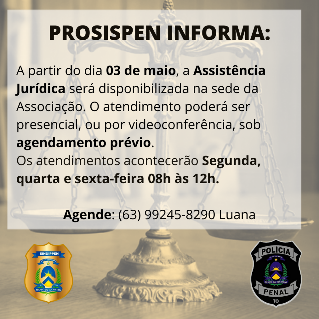 A Associação dos Policiais Penais do Tocantins informa a todos os filiados que a partir de 03 de maio de 2021, devido a pandemia do novo coronavírus, será disponibilizado na sede da Associação a Assistência Jurídica. Os atendimentos serão realizados na segunda, quarta e sexta-feira, de 08h às 12h.